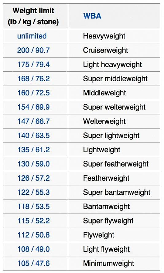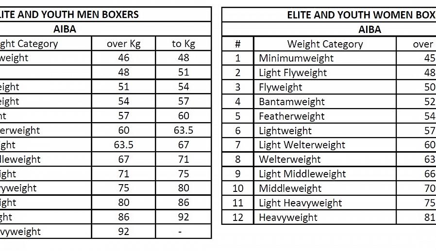 בסך הכל, ישנן 17 קטגוריות שונות ומגבלות משקל עבור גברים ונשים כאחד. החריגים היחידים הם הבאים: באגרוף לנשים, אין משקל סיירות והמשקל המינימלי באגרוף במשקל כבד נמוך יותר מאשר באגרוף לגברים.