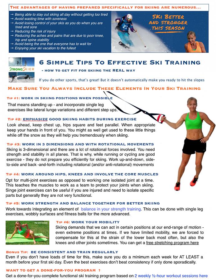 תוכנית אימונים המיועדת לכושר לסקי כוללת בדרך כלל אלמנטים המאפשרים לספורטאי לעבוד עם משטחים לא יציבים. הכלי הנפוץ ביותר עבור זה הוא הכדור המתאים. כמו כן, עלינו להדגיש את חשיבות העבודה באזור הבטן, תוך התמקדות בשרירים הצדדיים.