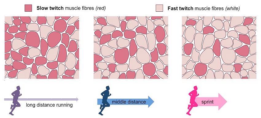 תשעים אחוז מסיבי השריר בשוקיים של רצי מרתון הם סיבי תפרים איטיים בעוד שיותר מ-75 אחוז מהם הם סיבי עווית מהירים אצל אצים. כמובן, סיבי שריר הם לא הדבר היחיד שספורטאים צריכים כדי לרוץ מהר יותר או לסבול, אבל הם בטוח עוזרים להם להגיע ליעדים שלהם.