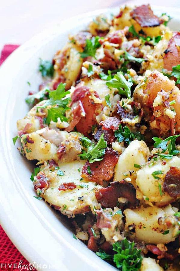 1. מביאים לרתיחה מחבת מים, מוסיפים את תפוחי האדמה ומבשלים אותם 10 דקות. כדי לראות אם הם מבושלים, מחוררים אותם עם סכין או מזלג. תנו להם להתקרר בזמן שאתם מכינים את שאר המרכיבים. אפשר לבשל את תפוחי האדמה מבעוד מועד להכנה מהירה יותר.