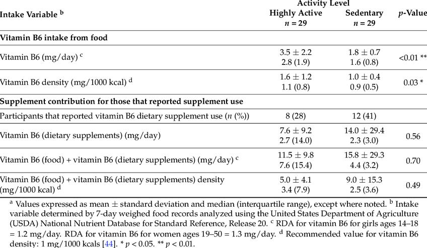 כפי שראינו, ויטמין B6 הוא מרכיב תזונתי בסיסי בתהליכים מטבוליים רבים הקשורים להשגת אנרגיה בגוף. באופן טבעי, דרישה לאנרגיה גבוהה יותר עקב תרגול ספורט קבוע, תגביר את הדרישות של ויטמין b6. עם זאת, אדם העוקב אחר תזונה מאוזנת לא צריך לדאוג לגבי מחסור אפשרי של חומר תזונתי זה.