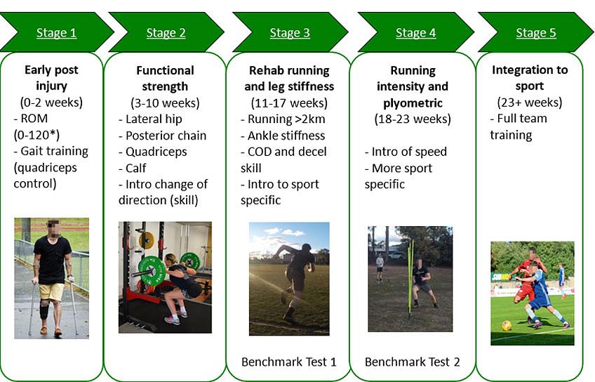 - שיקום ספורט גופני: בשלב זה, על הספורטאי לאמן מחדש את מצבו הגופני כדי לשקם ולשפר את הדפוסים והמנועים הפיזיים.