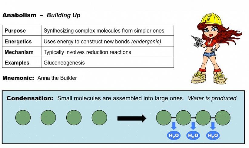 תהליך זה ידוע גם בשם ביוסינתזה. במהלך אנבוליזם, מולקולות פשוטות הופכות למולקולות חדשות גדולות ומורכבות יותר, התורמות ליצירת רקמות חדשות ומסייעות להזין רקמות קיימות.
